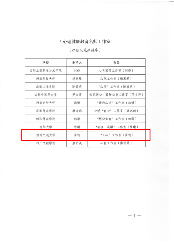 雷鸣副教授主持的“‘正心’工作室”入选四川省心理健康教育名师工作室。