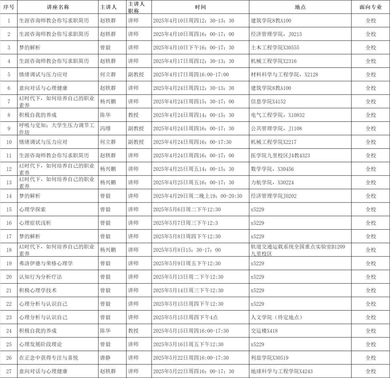 面向学院开展27场心理创新讲座