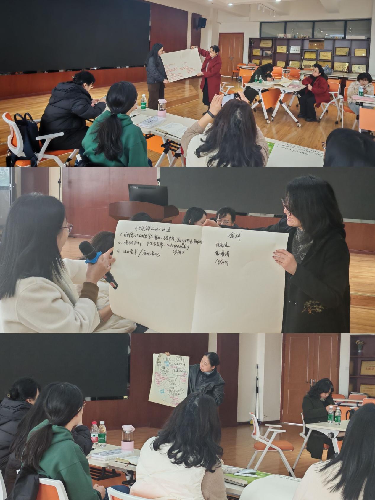 赵轶群、高飞、唐静三位老师代表各自小组向所有参会教师展示分享课程内容安排、教学资源的选择、活动的设计等。