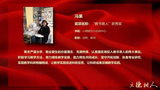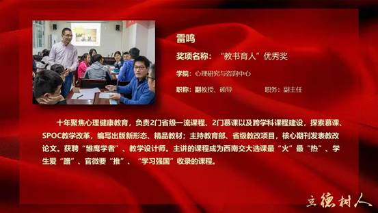 心理澳门六合彩开奖直播 雷鸣老师获“教书育人”优秀奖
