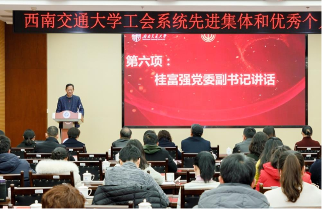 2021年12月22日上午,西南交通大学工会系统先进集体和优秀个人表彰大会在犀浦校区综合楼148会议室举行。校党委副书记桂富强出席表彰大会,工会系统受表彰先进集体及优秀个人代表,学校第七届教代会暨第二十届工代会工会干部代表,各部门工会主席、上届主席代表、工会委员代表参加大会。大会由校工会副主席李煜宏主持。校工会主席郑江作工会系统表彰工作报告,她指出校工会将构建“新时代工会工作体系”的总体目标,实施“1366”西南交通大学新时代工会工作行动计划,打造具有“引导力、凝聚力和服务力”的工会组织,构建“思想教育、民主管理、组织建设、岗位建功、服务帮扶、文化建设”六个工作体系,实施“聚力、汇智、匠心、暖心、活力”六大工程。