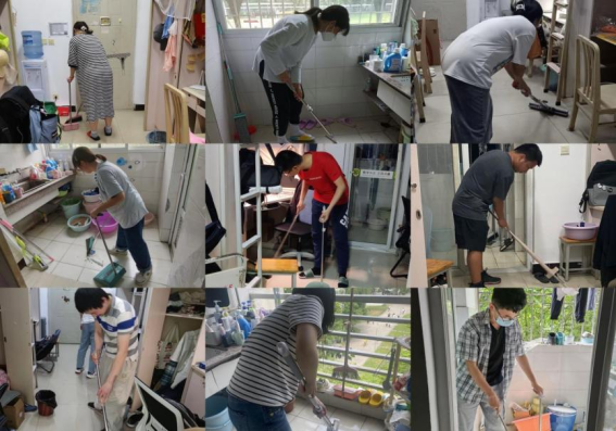 本科生和研究生的积极响应。在寝室卫生大扫除期间,同学们拿起劳动工具,分工协作,以饱满的热情和积极的状态对宿舍的地面、瓷砖、洗手池、卫生间等处进行了认真地清扫。