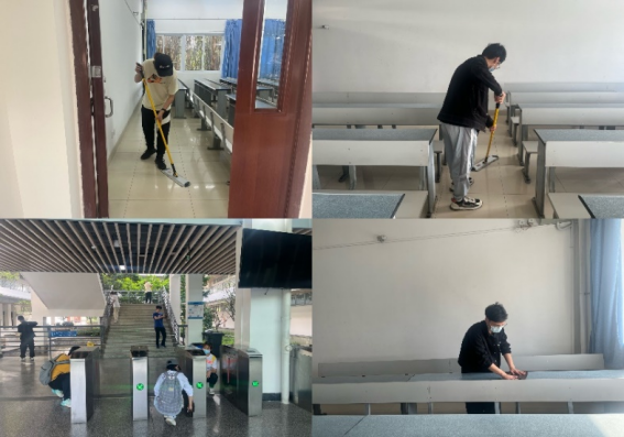 的几位同学在熊偲羽老师的带领下参加了学校组织的劳动实践活动,该活动在犀浦校区七号教学楼进行。活动期间,各位同学在工作人员的带领下完成一系列清扫任务。同学们根据相关要求对教室桌椅及走廊附属物进行抹尘,地面进行垃圾清扫以及湿拖。