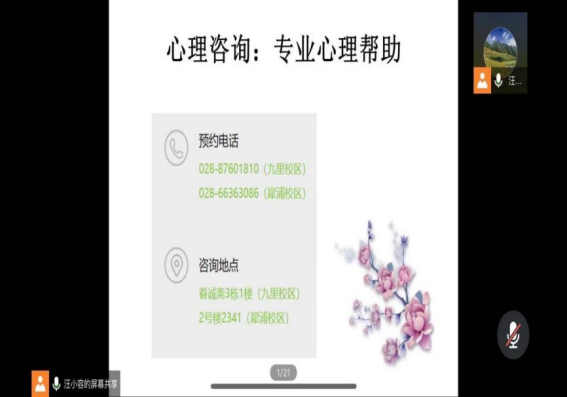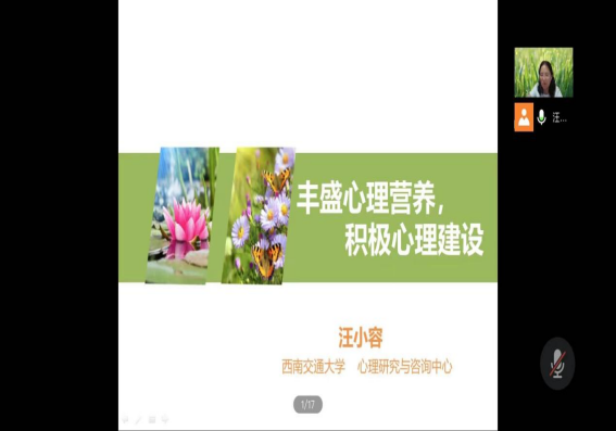 此次讲座汪小容老师围绕积极心理建设的主题帮助同学们全面地理解疫情下的不良情绪与如何排解这些情绪,不仅让同学们能更好地调整情绪,还让同学们对心理学有了更进一步的了解。