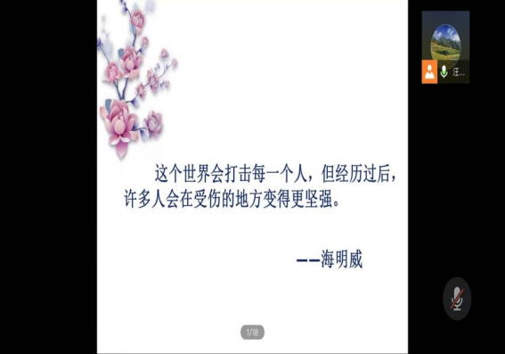 讲座中,汪小容老师向我们分享了海明威的名言“这个世界会打击每一个人,但经历过后,许多人会在受伤的地方变得更坚强。”她向大家描述了在疫情中可能出现的各种不良情绪,同时展示了健康情绪的标准。