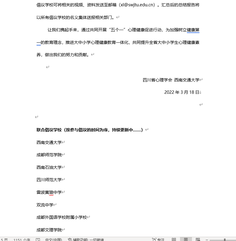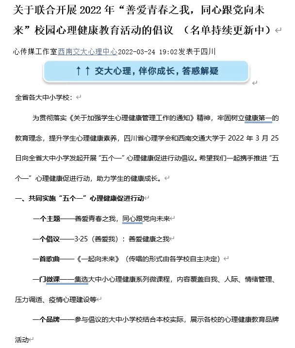为贯彻落实《关于加强学生心理健康管理工作的通知》精神,牢固树立健康第一的教育理念,提升学生心理健康素养,四川省心理学会和澳门六合彩开奖直播(中国)官方网站 于2022年3月18日向全省大中小学发起开展“五个一”心理健康促进行动倡议。本次活动有全省大中小学近50所学校参加。