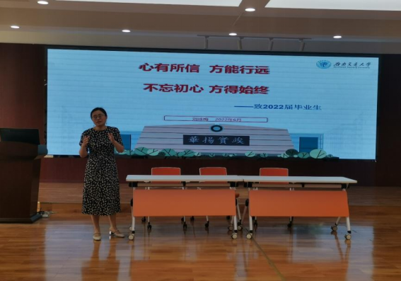 “心有所信,方能行远;不忘初心,方得始终”。在党课中,刘咏梅书记通过革命先辈的故事对这两句话进行解读,对毕业班党员提出了殷切的嘱托和期待,希望同学们心中有信仰,脚下有力量,要牢记党的宗旨、初心和使命,在新的起点上拿出拼劲和干劲,全心全意为人民服务,创造有价值的人生。