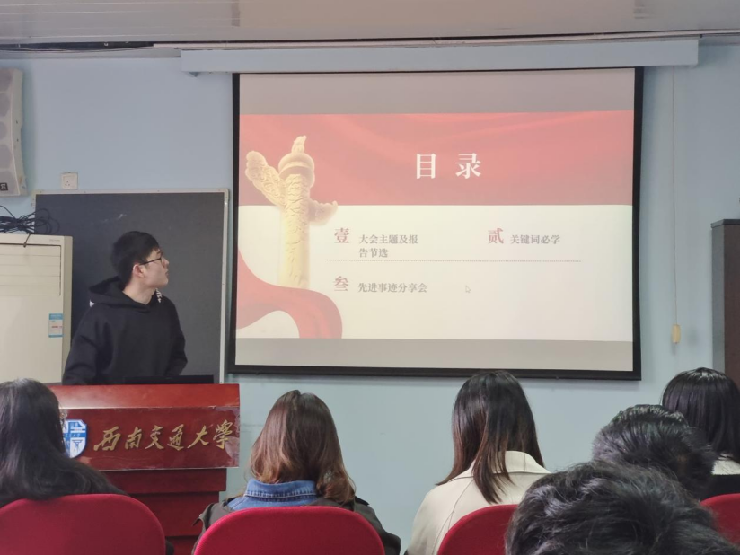 会议第二阶段,在孙龙同学的带领下,与会全体党员共同学习二十大精神。与会全体党员从二十大报告中了解二十大主题,学习二十大思想,感悟二十大精神,并对二十大中出现的“三个务必”“五个坚持”“新安全格局”“五个必由之路”“极不寻常、极不平凡的五年”等关键词进行了深入地学习。