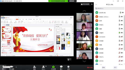 2018级本科2班通过直播软件召开了“同心战疫,爱国力行”主题班会。本次班会由2班团支书杨涵玉主持,心理澳门六合彩开奖直播