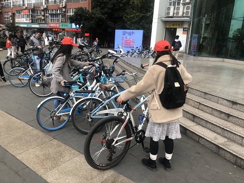 青协的志愿者们分散到西南交通大学一二食堂门口,开展自行车协助摆放活动。