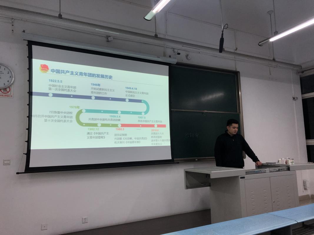 胡崟虎同学先带着团员们回顾了中国共产党和中国共青团的光辉历史,让团员了解共青团的原则,提高团员对共青团的归属感。除此之外,胡崟虎同学还明确了团支部委员(团支书、宣传委员、组织委员等)的分工。他为到场同学展示了《团章》里的一句话:“团的干部是团的工作的骨干。”对团干部提出了以下要求:政治上要坚强;学习上要刻苦;工作上要创新;作风上要扎实;品德上要高尚。此次活动在团员热烈的掌声中结束。