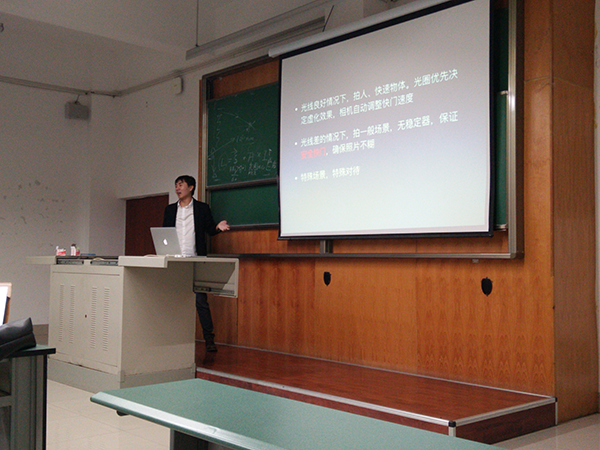 乔东同学首先从相机基本参数,基本构图方法等内容开始讲授,并用样例做了十分生动的演示,向到场同学简单介绍了Photoshop、Lightroom两个软件的基本操作。