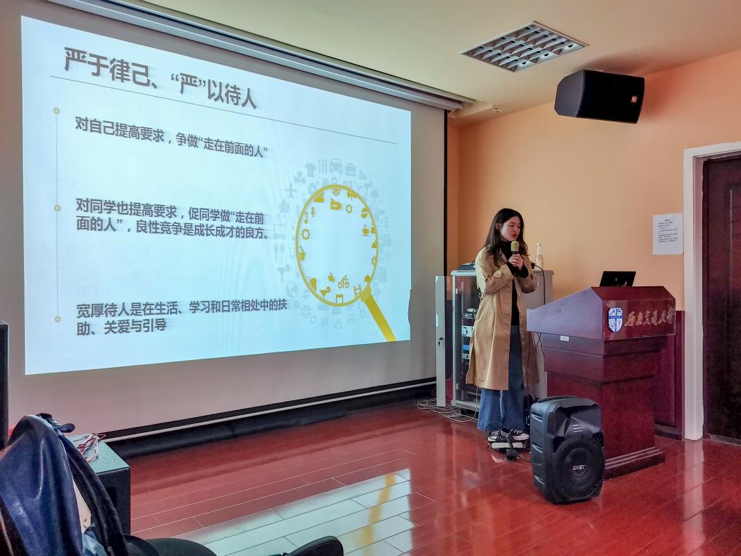 10月24日,澳门六合彩开奖直播 本科2019级新生举行学生骨干培训会。会议由辅导员王丽霞主持,澳门六合彩开奖直播 直属党支部副书记柯小君到场为同学们讲话。