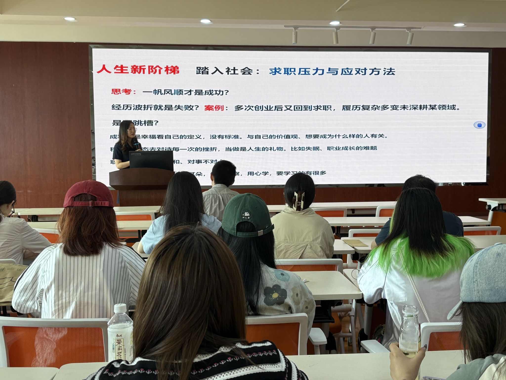 在樊菊老师的引导下,工作坊内容深入浅出,极具针对性。樊老师首先解析了新入职常见的职场压力源,帮助同学们识别和理解压力产生的根源,如角色适应困难、工作期望与实际落差、沟通协作挑战等。随后,她分享了多种实用的心态调节方法与技巧,涵盖情绪管理、培养积极思维模式、高效时间管理、建立职场支持系统以及自我关怀策略等内容。樊老师强调,提前了解并掌握这些心理调适工具,如同为即将启程的职场生涯装备了“心理缓冲器”和“能量补给包”,有助于毕业生们以更加自信、从容和坚韧的心态迎接挑战。