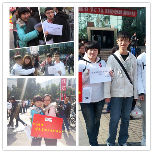 活动的特色是身着艾滋病文化衫的我们向每一位往来的同学索要拥抱,让他们消除对艾滋病人的主观恐惧;平和地面对艾滋病人;让他们感受到整个社会的人道主义气息,让他们感受到他们不再生活在社会的边缘,他们是我们的一份子。