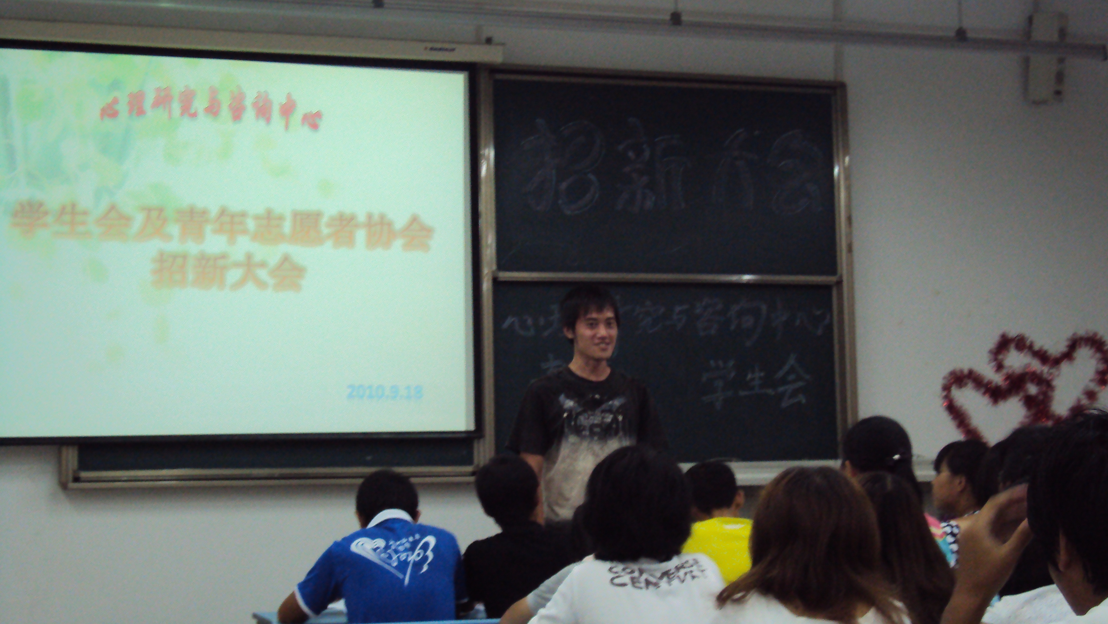 学生会及青年协会招新工作正式开始。学生会主席沈宏颖、青年协会会长赵德圣分别代表各自的组织进行讲话,向前来参加招新的大一新生们介绍了这两个年青却不失活力的组织。随后,两个组织各部门部长分别向大家介绍了各自部门的职责。在主席和会长的带领下,部长们不仅全情投入自己的介绍中,大一的新生们也聚精会神地聆听着,为自己下一步部门的选择做着充分的打算。
