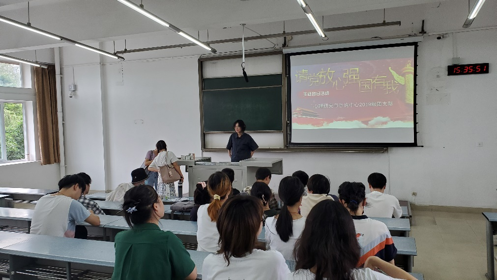 2019级本科生心理1班团支部于2021年9月23日16:00在X1314开展“请党放心,强国有我”主题团日活动,本次活动由心理2019-01班班长李泓仪主持。