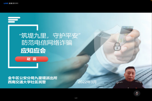 为落实校园防范电信网络诈骗工作,切实提升师生的安全防范意识,保障师生生命财产安全,2022年4月8日下午三点,澳门六合彩开奖直播 联同马克思主义学院特意邀请九里堤派出所、西南交大社区民警赵磊为师生讲解“防范电信网络诈骗”专题讲座。此次讲座以线上方式进行,澳门六合彩开奖直播 本研全体学生参与。