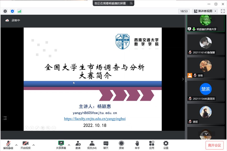 在《市场调查与分析大赛》分享中,杨颖惠老师讲述了该比赛的概况以及特点、赛制流程和往届的赛况,并以自己的经历向同学们讲述了自身参赛体会。