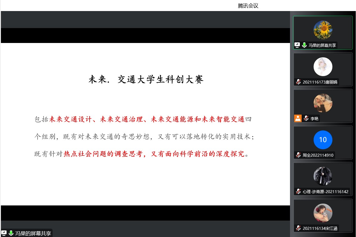冯果老师全面讲解了该竞赛的组别、对未来交通的设想和落实、对热点社会问题的调查思考和面向科学前沿的深度探究,并列举多个实例进行解释说明。