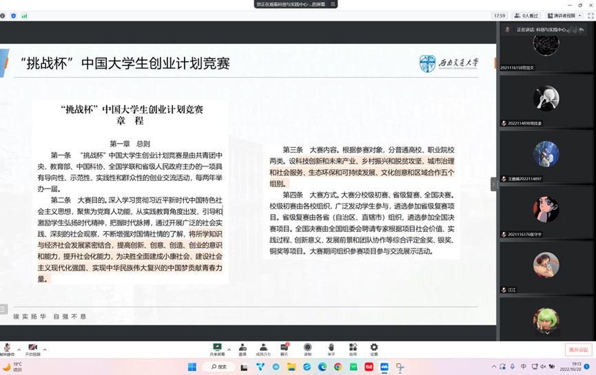 在《“挑战杯”中国大学生创业计划竞赛章程》分享中,有着三年挑战杯赛事组织经验和带队经验的杨潇潇学姐依据竞赛总则,为大家详细讲解了该竞赛的目的、内容和方式。