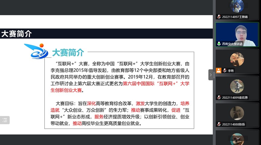 在《“互联网+”大学生创新创业大赛》分享中,李诗涵老师主要讲述了大赛的目的任务、比赛变化趋势、备赛建议以及获奖团队的参赛作品等内容,强调以创新引领创业、以创业带动就业,努力形成高校毕业生更高质量创业就业的新局面。