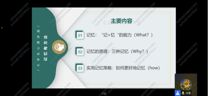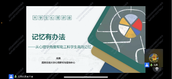 冯果老师,为信息学院本研学生开展“记忆有办法——从心理学角度帮助工科学生高效记忆”的专题心理讲座,针对工科学生普遍存在的记忆慢、记忆难、记忆不准确的共性问题,从心理学角度出发剖析记忆的关键和技巧,以多重视角来引导同学们更好地提高记忆能力。