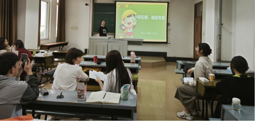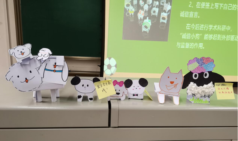 随后,吴科印组织同学们用卡纸、水彩笔等工具制作小狗,并在便签上写下自己的学术诚信宣言。通过制作“诚信小狗”与写学术诚信宣言,同学们对学术研究中的求真守真要求有了更深刻的理解。在今后进行学术科研中,“诚信小狗”将起到外部驱动与监督的作用。