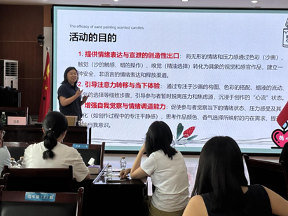 冯老师分别介绍了香熏沙画蜡烛团辅的意义、香熏沙画蜡烛材料介绍、沙画香熏蜡烛制作方法以及沙画香熏蜡烛作品展示四个环节,通过艺术创作与芳香疗法的结合,帮助教师在轻松愉悦的氛围中放松身心,同时培养审美情趣和创造能力。