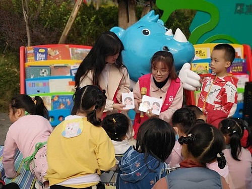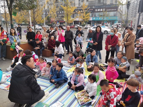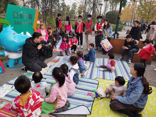 上午十一点,“情绪小讲堂”故事小屋开始了有趣的绘本故事阅读活动。志愿者们组织孩子们有序坐在野餐布上,听关于“情绪”的小故事。