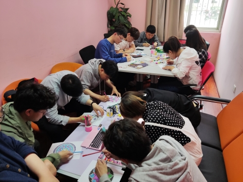 高老师先向大家介绍了何为心流体验,即在全神贯注、投入忘我的状态下感觉到的一种充满能量并且非常满足的感受。活动包含了编制中国结和彩绘曼陀罗两个环节。同学们积极参与、全神贯注投入到活动中,每个人都认真分享了自己的感受,包括自己最近的烦恼与压力和这次活动带给自己的感受。