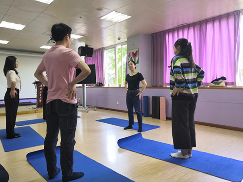 在大家做过自我介绍后,高老师在轻柔的音乐中指引大家闭上眼睛冥想,关注自己的呼吸;然后带领大家做发声训练,并引导大家在发声时感受自己身体的各个部位;接着又带领大家在放松状态下从下往上依次感受、放松自己身体的各个部位;最后一个活动是随意舞动,可以与空间内的所有东西发生联系。