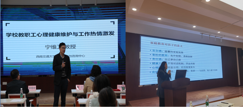 宁维卫教授和张学伟副教授分别做《教职工心理健康维护及工作热情激发》和《亲子关系赋能》专题讲座。宁维卫教授结合自身丰富的工作经验,从“准确把握心理问题的本质”、“调整心态,建立理性思维”、“提升情商,激发正能量”和“高校教师扮演的三类角色”四个方面,深入浅出、风趣幽默地讲解了教职工该如何面对压力及情绪管理。张学伟副教授结合自身丰富的咨询经验,通过真实的案例,讲授了如何建立良好的亲子关系。