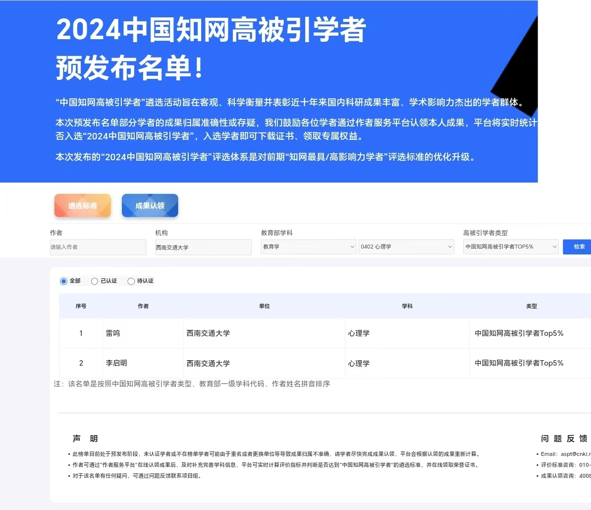中国知网中国科学文献计量评价研究澳门六合彩开奖直播 基于中国知网收录的国内学术期刊论文和会议论文,2024年首次开展学者学术影响力客观评价,遴选了“2024中国知网高被引学者”名单。“2024中国知网高被引学者”采用的评价指标为作者发表论文的加权总PCSI。PCSI是指论文引证标准化指数(Paper Citation Standardized Index),系知网为实现论文跨学科、跨年度可比而对论文被引频次的标准化数值。