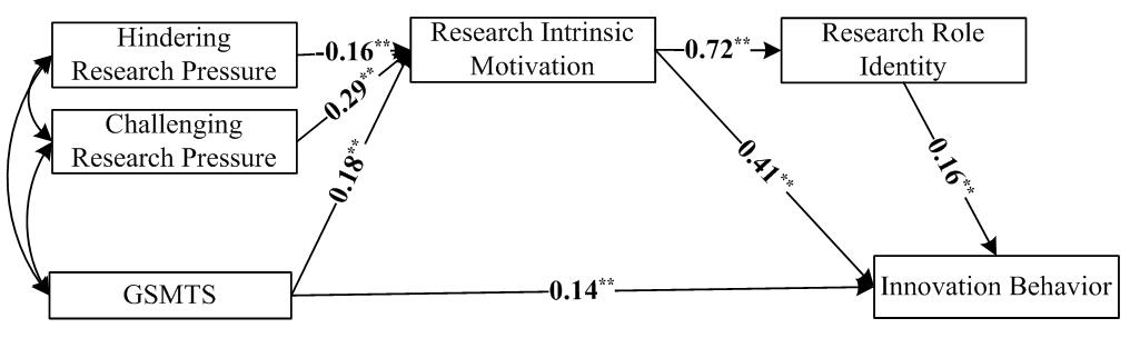 研究团队发现,阻碍性科研压力负向预测科研内在动机,而挑战性科研压力正向预测科研内在动机。然而,师门支持能够直接正向预测研究生创新行为,以及科研内在动机和科研角色认同在其中起了链式多重中介作用。