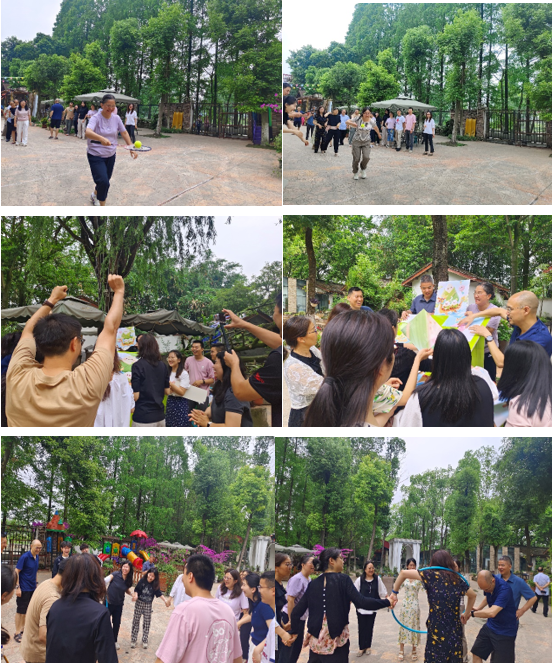 在环境优美的蜀绣苑内,"托球接力"老师们稳持球板轻盈奔跑。"拼图大作战"环节,各组争分夺秒复原《龙舟竞渡》图案。"一圈到底"中呼啦圈在老师们摇曳的身姿中舞动。