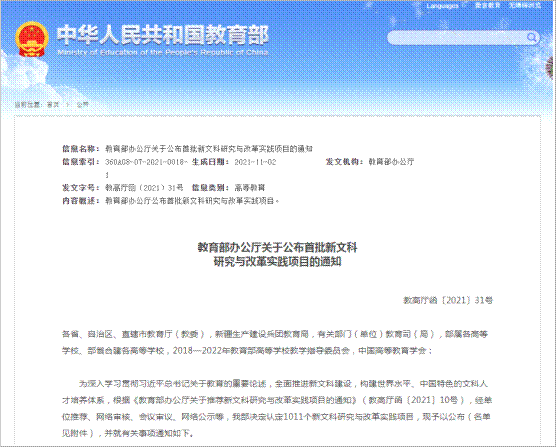 2020年11月,教育部新文科建设工作组在山东大学召开新文科建设工作会议,发布了《新文科建设宣言》,对新文科建设作出了全面部署。2021年3月学校教务处启动了新文科研究与改革实践项目的申报工作。澳门六合彩开奖直播