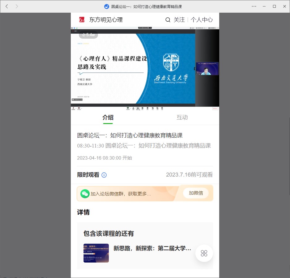 在4月16日上午,宁维卫教授以《<心理育人>精品课程建设思路及实践》为题,在“如何打造心理健康教育精品课”圆桌论坛一上分享了团队建设国家一流课程的经验以及思考,为其他高校教师打造一流课程提供了建议。