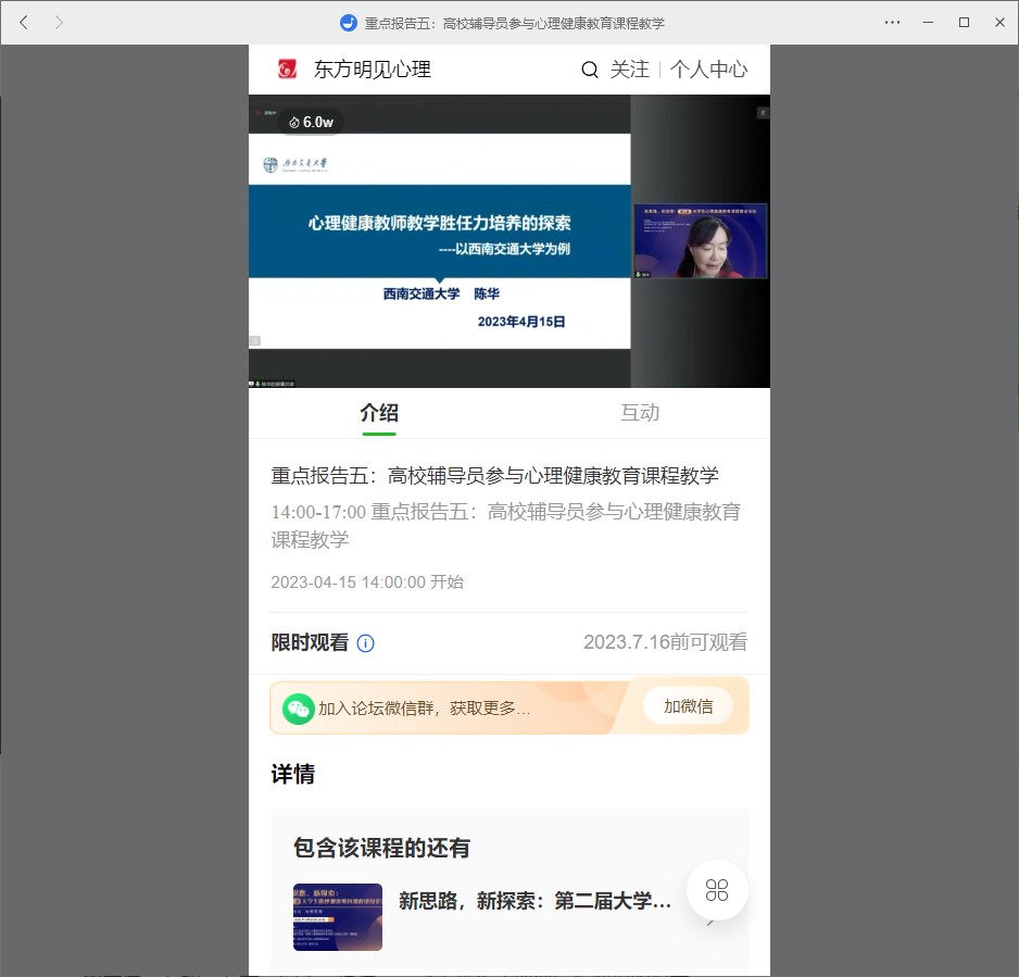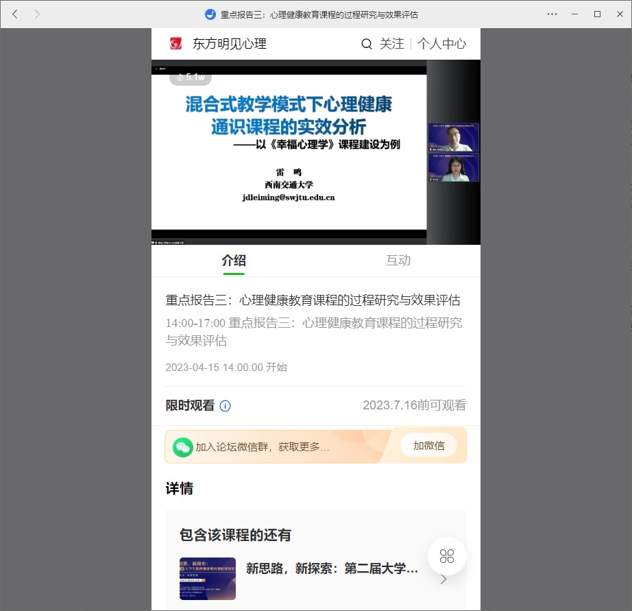 在4月15日下午,陈华教授、雷鸣副教授分别以《心理健康教师胜任力培养的探索》、《混合式教学模式下心理健康通识课程的实效分析——以<幸福心理学>课程建设为例》在“高校辅导员参与心理健康教育课程教学”、“心理健康教育课程的过程研究与效果评估”重点报告论坛分享了学校心理健康教师胜任力的培养经验、“幸福心理学”课程混合式教学实践的经验。