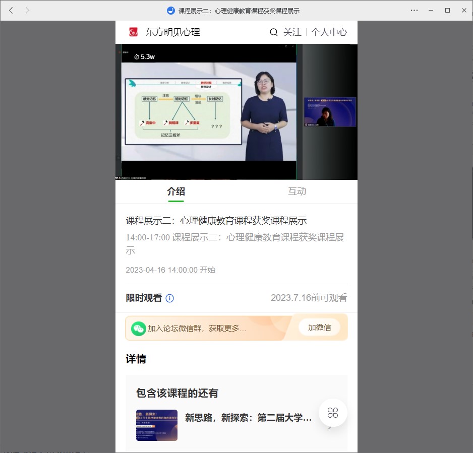 在4月16日下午,冯果博士以《“记忆有办法”微课实践展示》为题,在“心理健康教育课程获奖课程展示”环节中和与会人员分享了这段微课程的创作经历以及自己的反思。