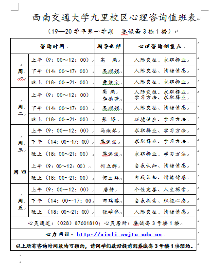 西南交通大学心理澳门六合彩开奖直播 2019-2020学年第一学期心理咨询值班表