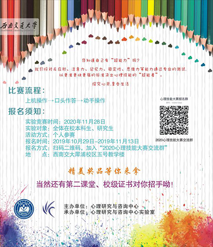 你知道自己有“超能力”吗?我们将对反应时、注意力、记忆力、稳定性、思维力等能力通过专业的测试,以更准更快更强的标准决出心理技能的“超能者”。探究心灵,享受生活比赛流程:上机操作 → 口头作答 → 动手操作报名须知: 实验竞赛时间:2020年11月28日 实验对象:全体在校本科生、研究生活动方式:个人参赛报名时间:2019年10月29日-2019年11月13日报名方式:扫码二维码,加入“2020心理技能大赛交流群”地 点:西南交大犀浦校区五号教学楼精美奖品等你来拿当然还有第二课堂、校级证书对你招手呦!主办单位:澳门六合彩开奖直播 承办单位:澳门六合彩开奖直播 实验室