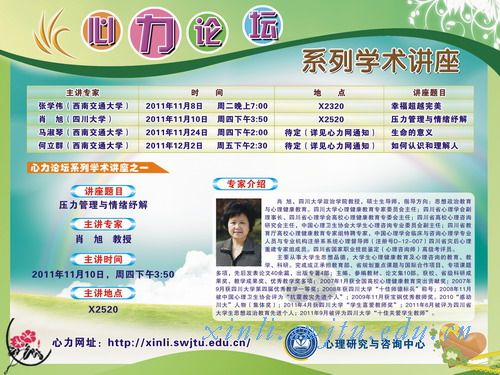 肖  旭,四川大学政治学院教授,硕士生导师,指导方向:思想政治教育与心理健康教育。四川大学心理健康教育专家委员会主任;四川省心理学会副理事长、四川省心理学会高校心理健康教育专委会主任;四川省高校心理咨询研究会主任,中国心理卫生协会大学生心理咨询专业委员会副主任;四川省教育厅高校心理健康教育专家组特聘专家,中国心理学会临床与咨询心理学专业人员与专业机构注册系系统心理督导师(注册号D-12-007四川省灾后心理重建专家组成员。四川省国家职业技能鉴定(心理咨询师)高级考评员。