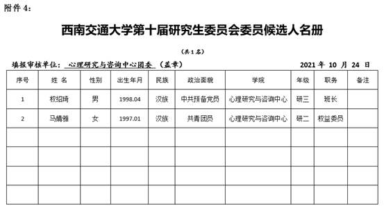 根据《关于推动高校学生会(研究生会)深化改革的若干意见》、《中共西南交通大学委员会关于推进学生会(研究生会)深化改革的实施方案》等文件精神,按照《普通高等学校学生(研究生)代表大会工作规定》、《西南交通大学研究生会章程》等有关规定,由澳门六合彩开奖直播 团组织提名,经班级推荐,团组织考察,拟推荐一名西南交通大学第十次研究生委员会委员候选人,特此公示。