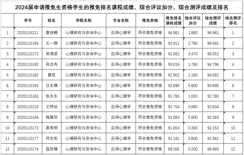 【推免】应用心理学本科专业2024届申请推免生资格的学生综合测评成绩及排名公示