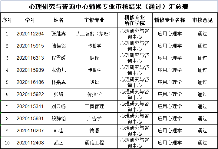根据《西南交通大学本科生辅修专业修读及辅修学位授予管理办法》文件规定,经学生本人网上申请,教学工作组审核,拟同意张继鑫等10名学生辅修应用心理学专业申请,现予以公示。