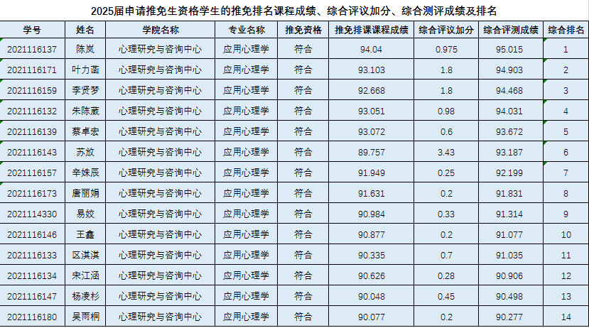 【推免】应用心理学本科专业2025届申请推免生资格的学生综合测评成绩及排名公示