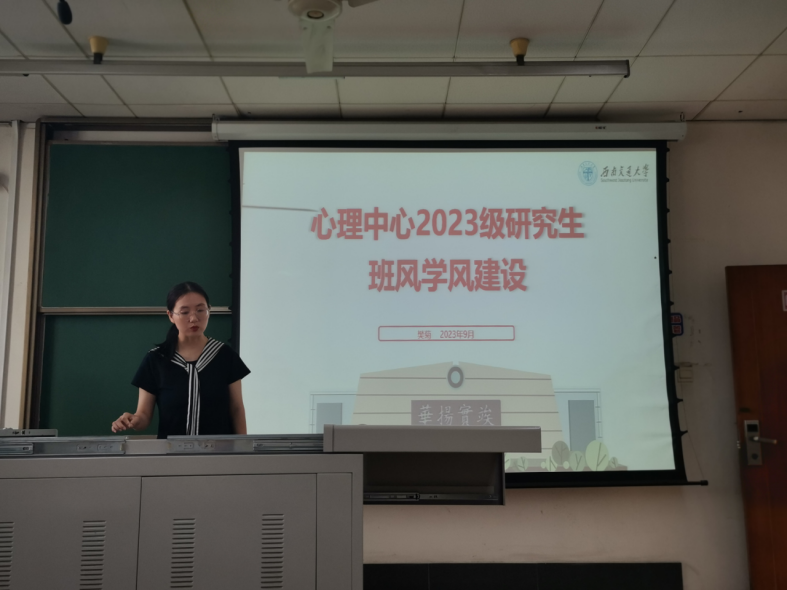 2023年9月13日,在九里4519教室,2023级心理学硕士01班开展班风学风建设和就业指导主题班会。会议由辅导员樊菊老师主持,班级全体同学参加。