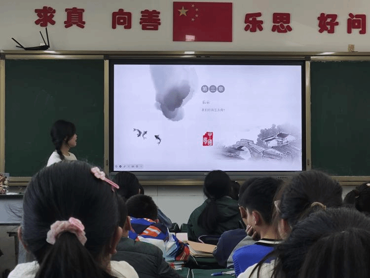 本次课堂开始,老师以一首诗(杜甫的绝句)引入,优美的诗句使同学们进入课堂状态。接着找了一位同学大声朗读诗句,调动了同学们的积极性。