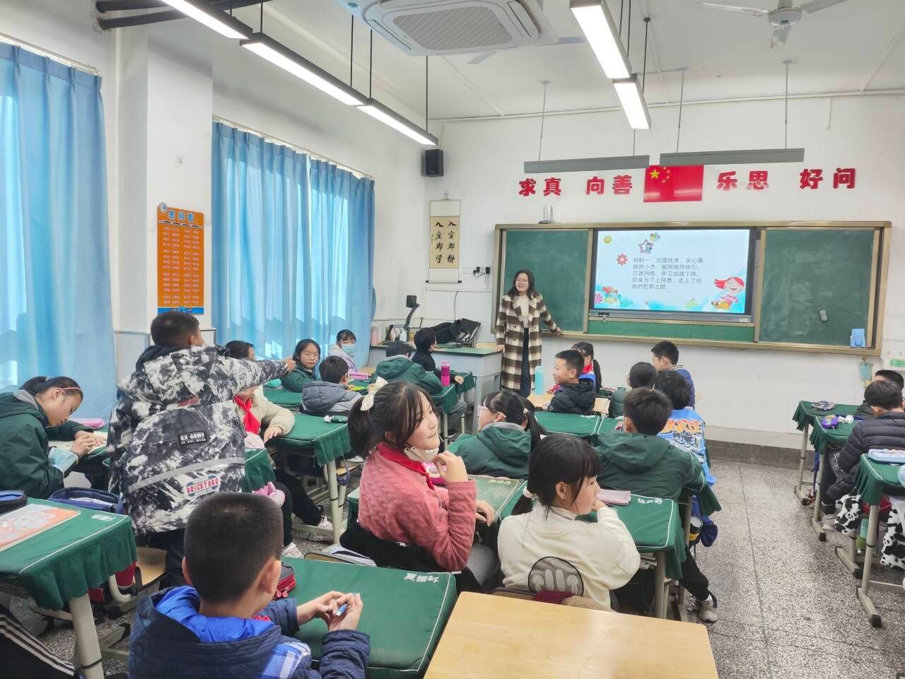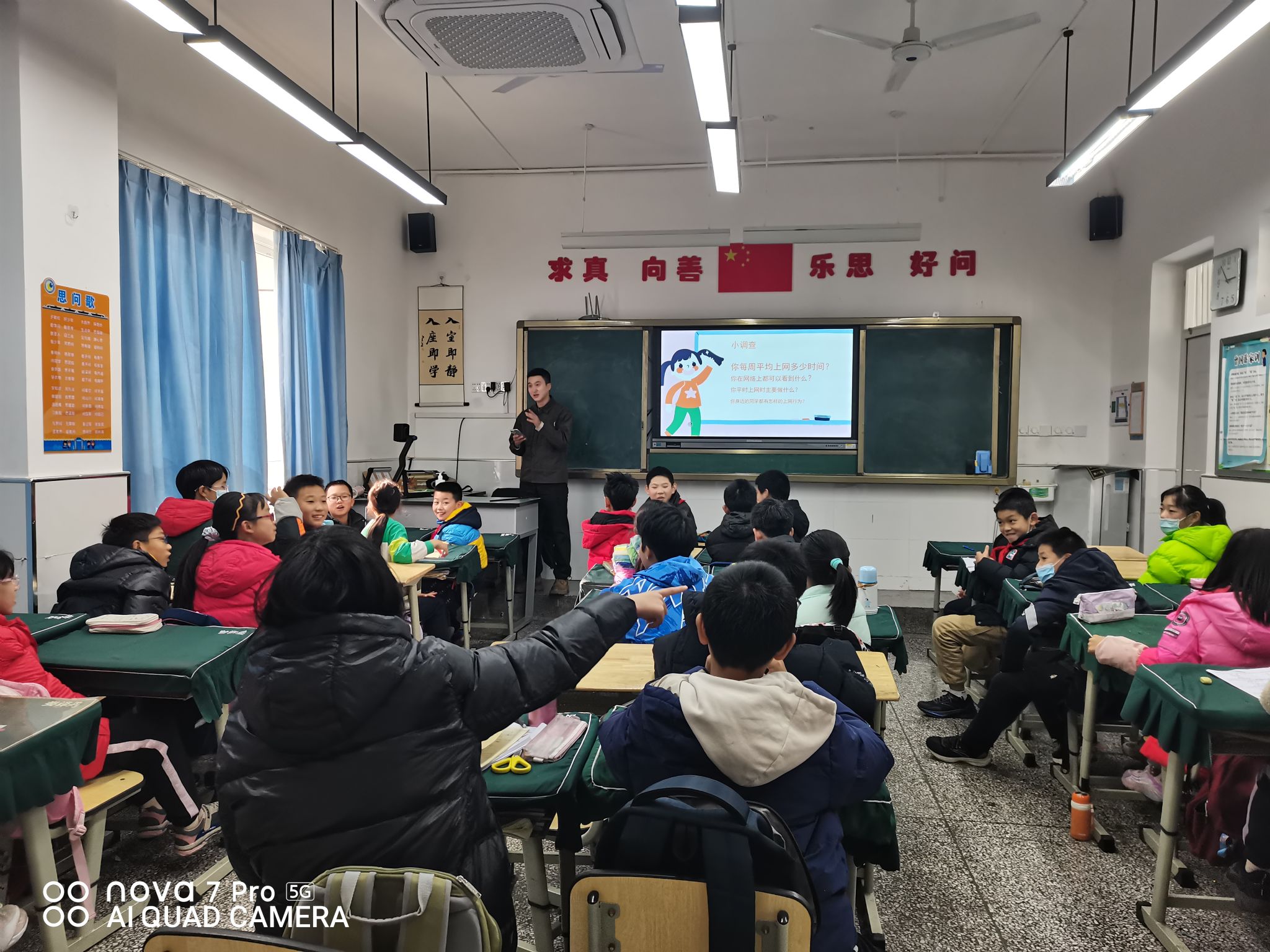小采访环节,老师向同学们询问关于网络使用的情况,了解同学们的上网状态,彼此通过分享不同的看法观点拉进距离,了解网络危害,使同学们积极投入课堂中,勇于发言。